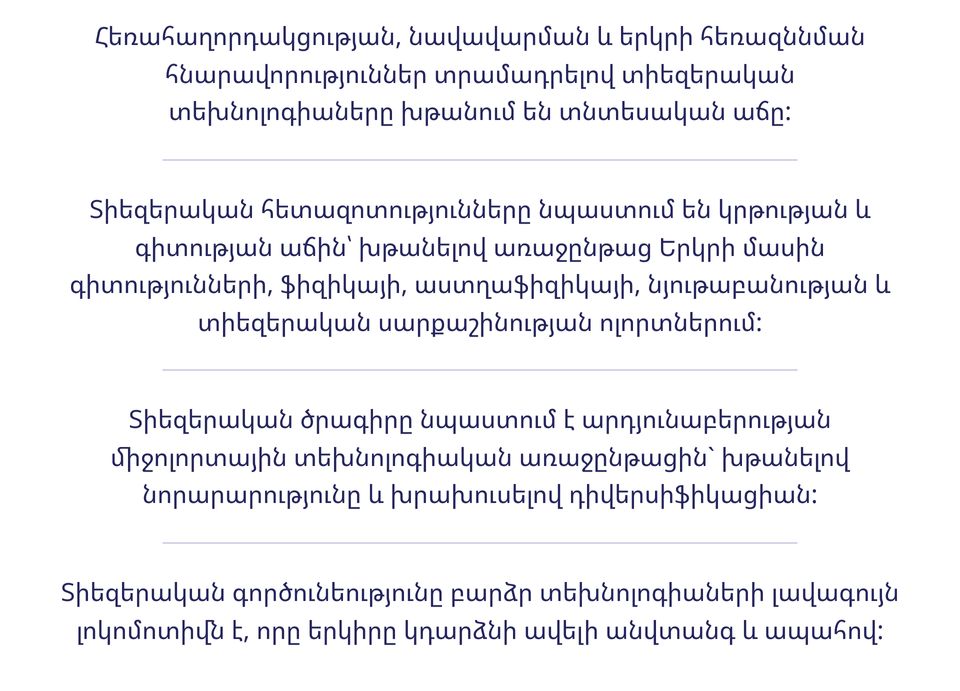 Կրթական և STEM հնարավորություններ. Տիեզերական ծրագրերի ներդրումը երիտասարդ սերնդին ֆունդամենտալ գիտական և STEM (գիտություն, տեխնոլոգիա, ճարտարագիտություն և մաթեմատիկա) ոլորտներ բերելու լայն հնարավորություններ է ստեղծում: