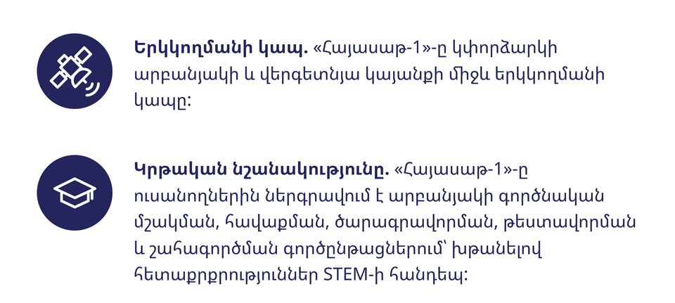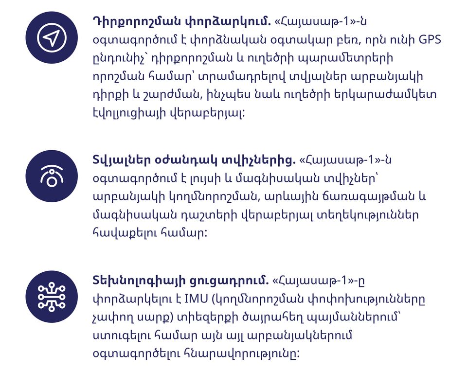 ⦾ Ուղեծրային պարամետրերը, ջերմային վիճակը և օգտակար բեռի աշխատանքը վերահսկվում են Հայաստանում մշակված սարքի կողմից, որի հիմնական գործառույթը կողմնորոշման փոփոխությունների գրանցումն է: