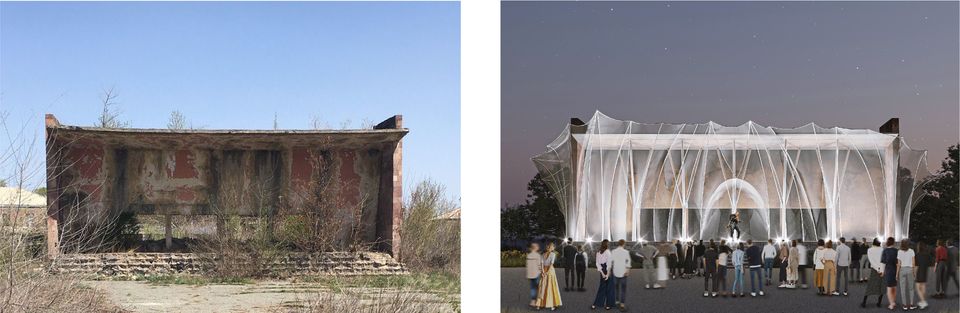 Բեմի շուրջ տեղակայվելու է անկախ ցանցային «վարագույր»՝ որը տանիքից հոսելով ընդգծելու է կիսավեր կառույցի փխրունությունը: Նուրբ ցանցը գիշերային ժամերին լուսավորվելու է։ Վերակառուցումից հետո բեմն ամբողջությամբ պահպանելու է իր պատմական տեսքը: